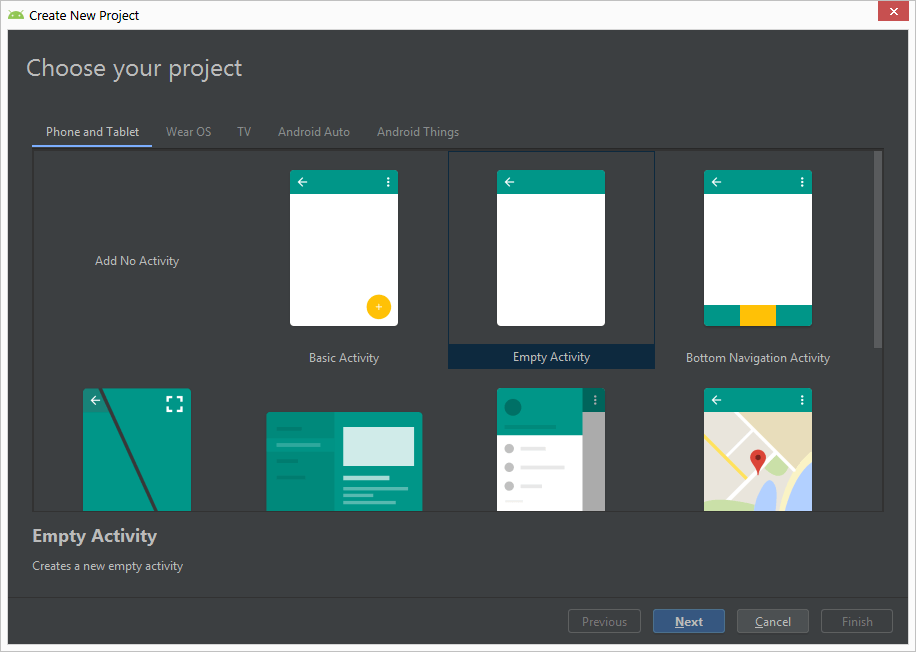 支持创建手机、平板、穿戴设备、电视等多个平台的工程。入门阶段选择第一个就好。 任意选一个Activity模板,例如:BasicActivity。