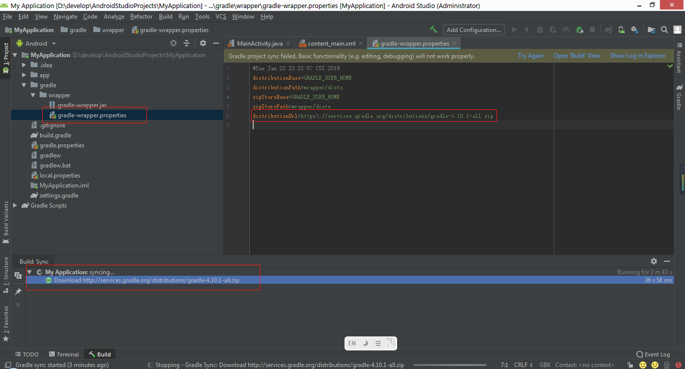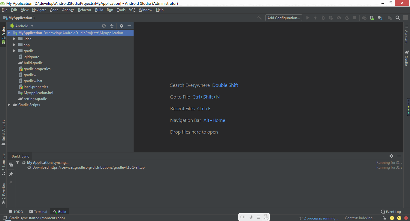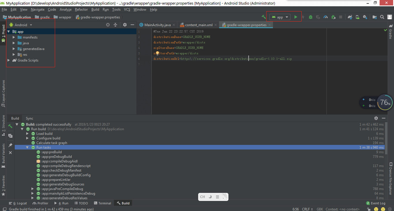最后,进入工程页面,图中正在下载 gradle 4.10.1 版本。