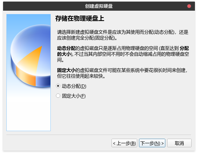 设置使用动态分配的方式。即,设置虚拟硬盘100G,最后根据实际的系统占用空间,占用物理硬盘空间。
