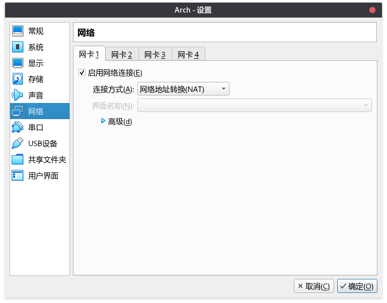 网络模式中,选择 NAT 模式。这样,虚拟电脑可以使用真机网络。