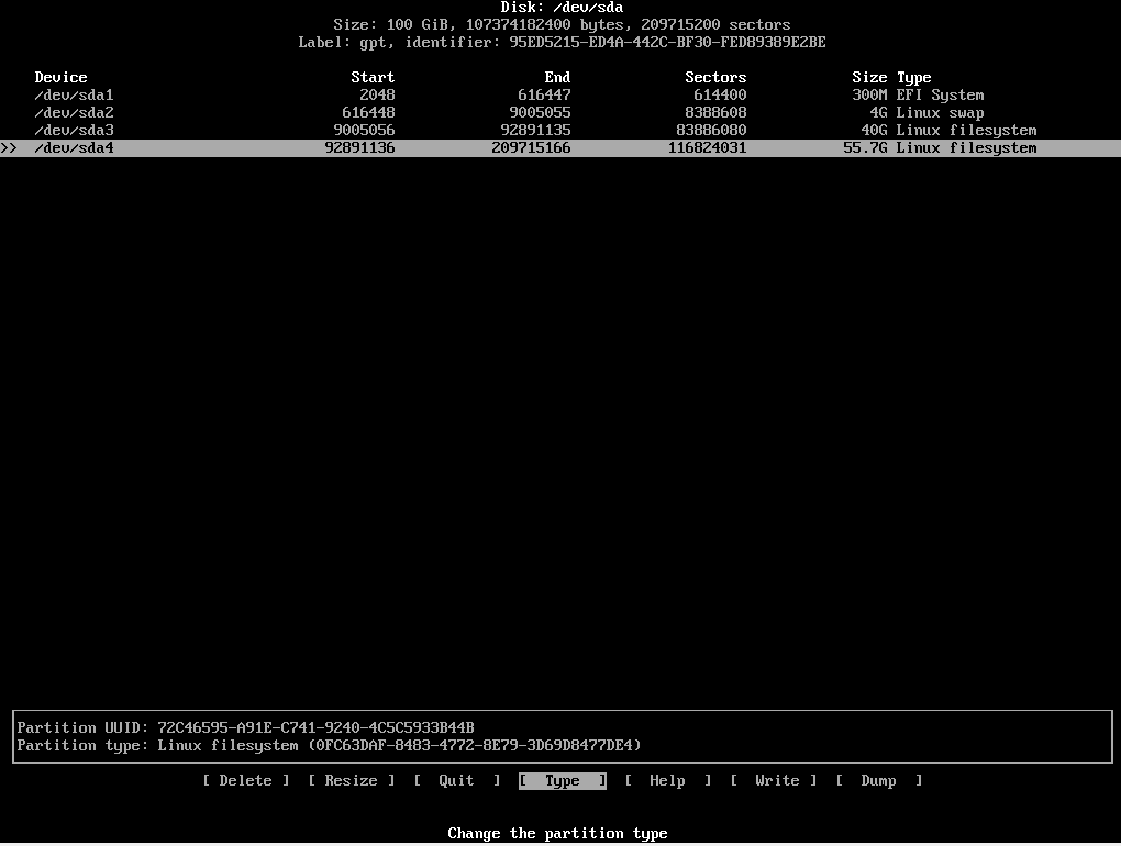 cfdisk /dev/sda # 对硬盘进行分区。可以只操作硬盘中的一个分区。cfdisk 命令弹出可交互式命令终端。真机安装时,希望只在其中一个硬盘分区中安装 Arch ,直接通过方向键选中待安装的分区,如,sda4 ,选择 Delete 删除分区信息。 New 新建分区,输入待分区大小。选择 Type 设置分区类型,主要有三个 :EFI System,Linux swap Linux filesystem 。选择 Write 写入分区信息。选择 Quit ,退出分区程序。分区示例,如下。