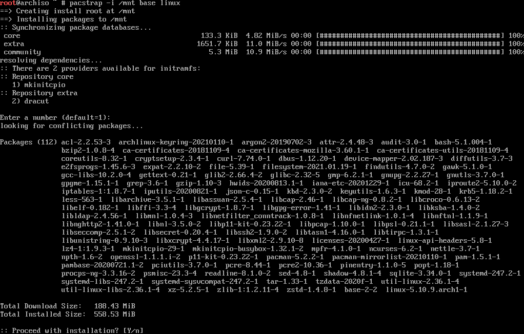 # 下载 arch 基础组件和 linux 内核,后面过程,全部回车