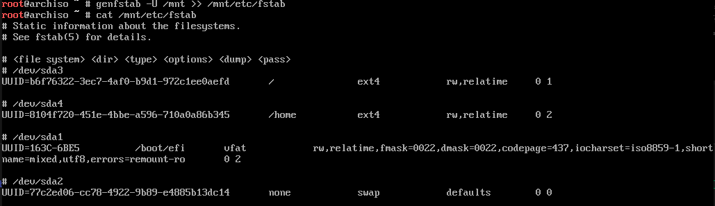 genfstab -U /mnt >> /mnt/etc/fstab