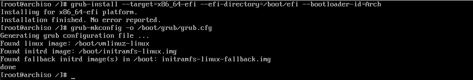 grub-install --target=x86_64-efi --efi-directory=/boot/efi --bootloader-id=Arch