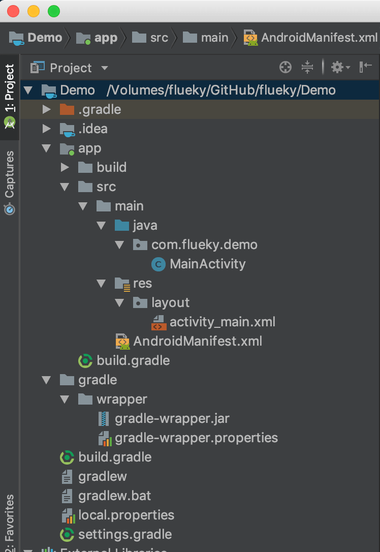 java目录下创建包名:com.flueky.demo,并创建MainActivity类。 - 在