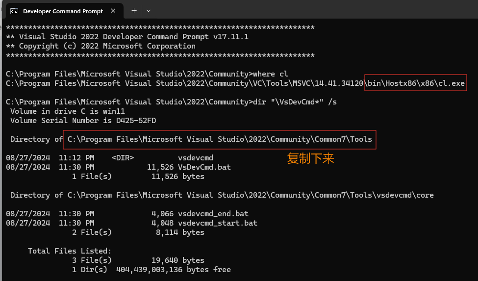 输入 where cl 和 dir "\VsDevCmd*" /s得到关键输出信息。保留,后面要用。