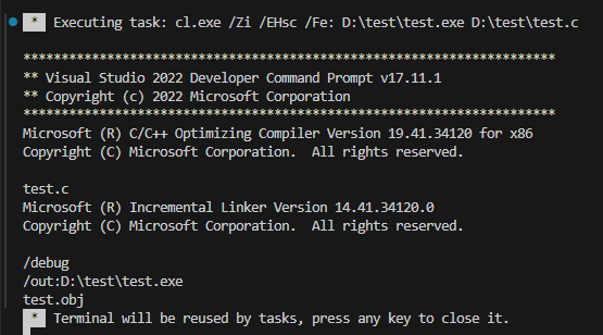 * Terminal will be reused by tasks, press any key to close it.以上操作,只有 windows 平台可以直接运行源文件,其他平台都只执行编译操作。 如需继续执行、调试,还需添加如下配置。