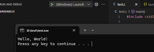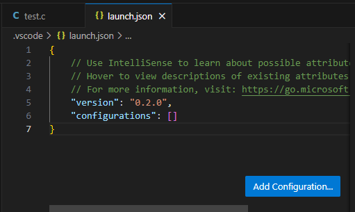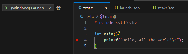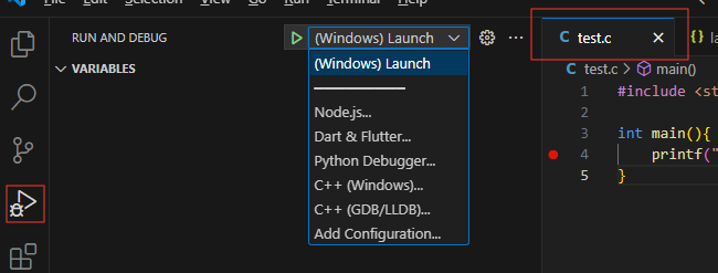}回到第一步的位置,能看到 (Windows) Launch,记住停留在 test.c 打开的位置。