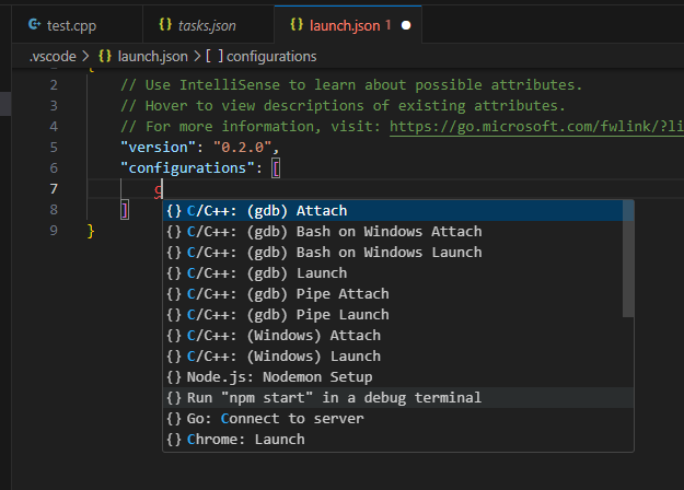 生成的 launch.json 文件如下。